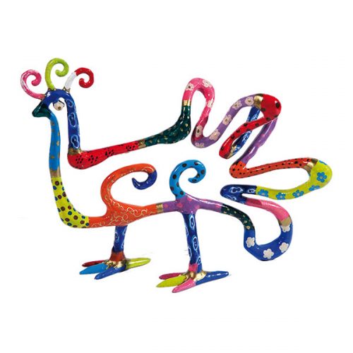 טווס צבעוני גאה במלוא הדרו. יצירה מדהימה ממתכת צביעה ידנית