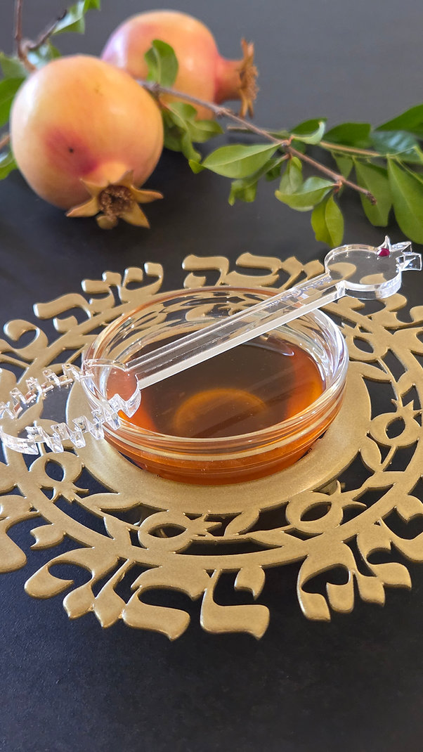 כלי לדבש מגזרת רימונים- מתכת צבע זהב+ כלי זכוכית מחוסמת לדבש