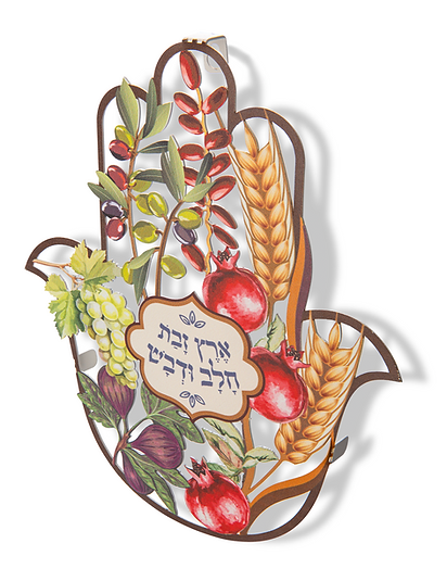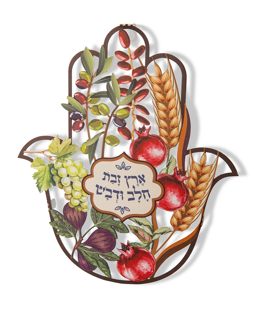 חמסה – תכשיט קיר ייחודי, עשוי מגזרת מתכת עם הדפס צבעוני.                                                                                    בעיצוב וניחוח ישראלי, עשירה וצבעונית מעוטרת בפירות משבעת המינים בהם התברכה ארץ ישראל, סמל לשפע, ברכה וחיבור לארץ.