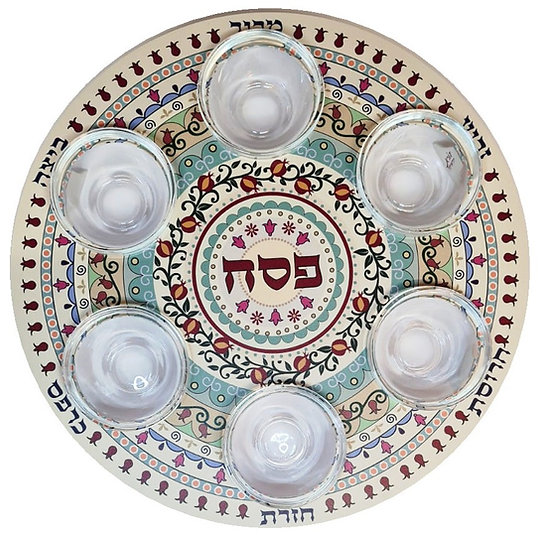 קערת סדר  יפיפייה ומרשימה עשויה מתכת בחיתוך לייזר והדפסה צבעונית עיטור רימונים + 6 צלוחיות זכוכית .