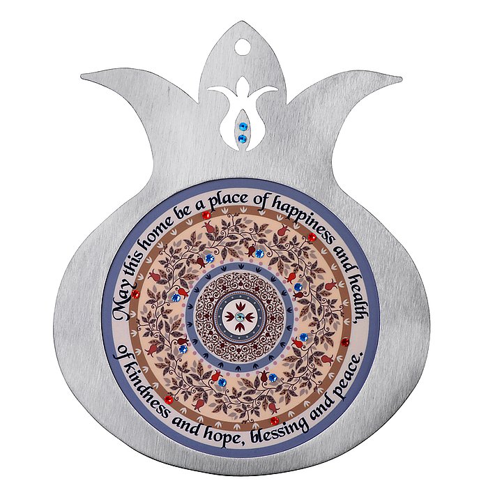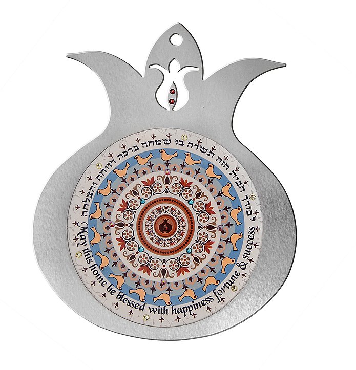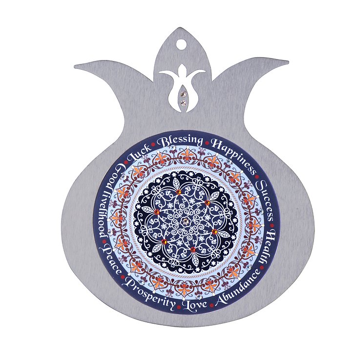 מגוון גדול של טקסטים וברכות בעברית, באנגלית , ושילוב של שתי השפות לבחירה                                                            רימוני קישוט עשויים מסגרת נירוסטה בשילוב הדפס צבעוני ואבני סברובסקי. הרימונים מעוטרים במוטיבים מהמסורת היהודית ובמנדלות צבעוניות, במגוון רחב של טקסטים וברכות.
