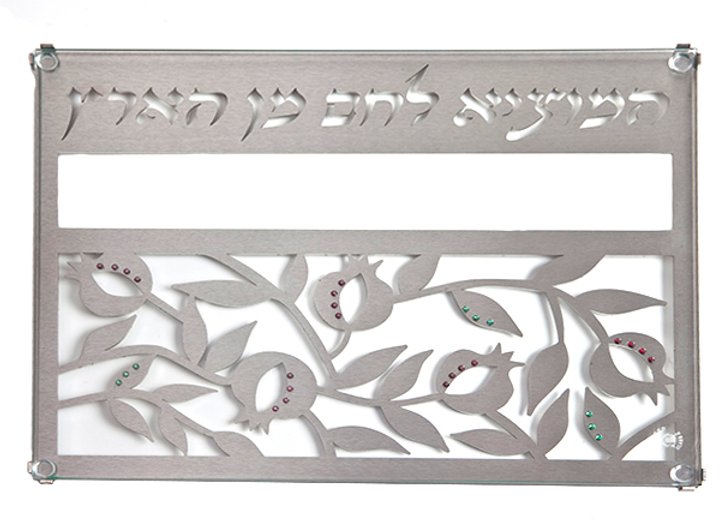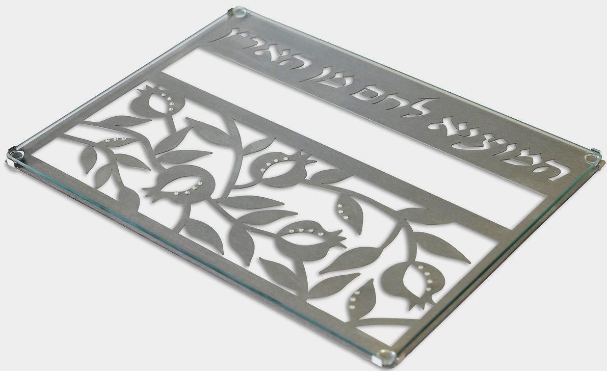 מגש חלה – אלגנטי במיוחד, בחיתוכי לייזר, מקושט באבני סברובסקי שקופות – (אפשר ללא) בדגם רימונים.